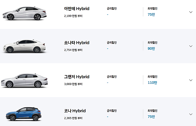 현대차에 하이브리드 차량은 아반떼, 쏘나타, 그랜저, 코나, 투싼 차량이 하이브리드 파워트레인을 갖추고 있으며 기본적인 전시차, 세이브오토, 블루멤버스 포인트 선사용 혜택외에는 특별한 혜택은 없습니다.