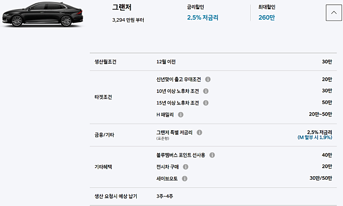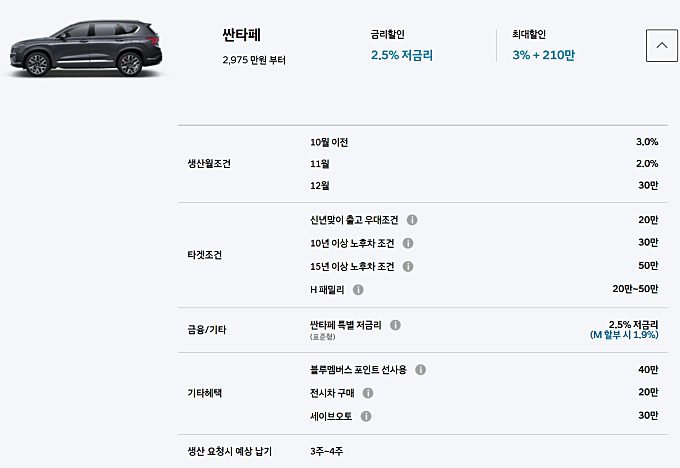 10월 이전 생산 3%, 11월 2%, 12월 30만원 할인이 가능하며