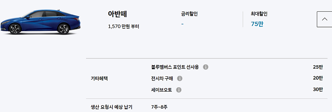 최대 75만원 할인이 가능하며, 생산납기는 원톤 8~9주, 투톤 9~10주 입니다.