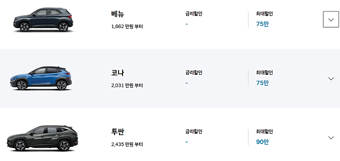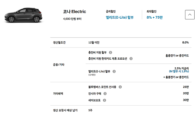 코나 또한 최대 75만원 할인이 가능하며, 생산납기는 3~4주 입니다.