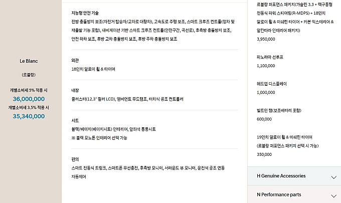 별도로 추가 선택 옵션은 파노라마 선루프 [110만원], 헤드업 디스플레이 [100만원], 르블랑 퍼포먼스 패키지 [395만원], 빌트인 캠 [60만원], 19인치 휠 및 타이어 [35만원] 를 선택할수 있습니다.