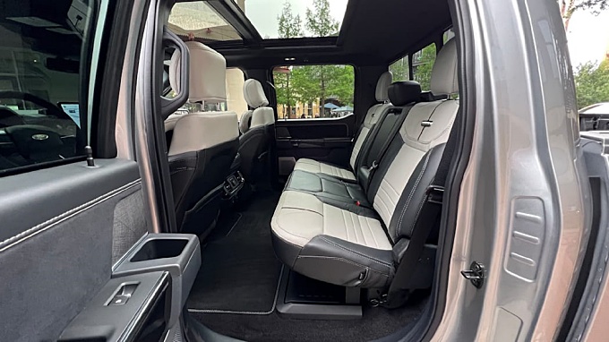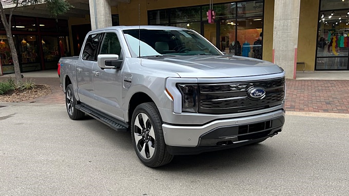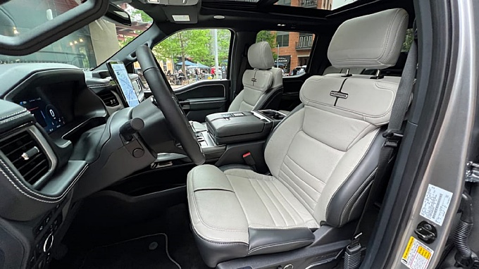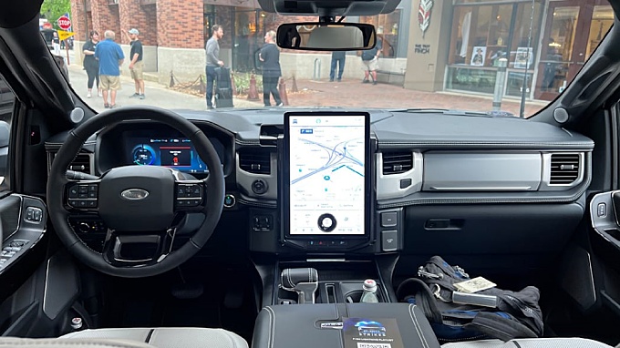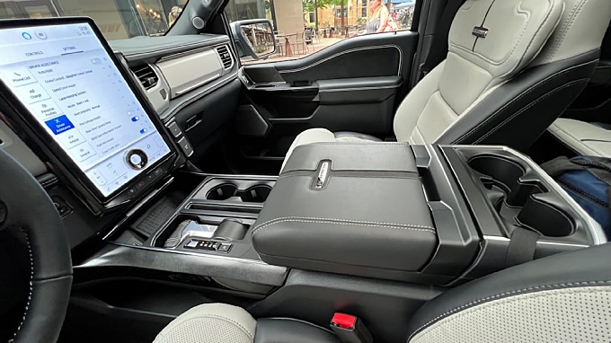 2022 포드 F-150 라이트닝의 첫 번째 주행은 Extended Range 배터리가 장착된 Platinum 트림의 주변의 공공 도로에서 이루어졌습니다. 15.5인치 인포테인먼트 화면은 인테리어의 헤드라이닝 기능입니다. 그러나 내부의 나머지 부분은 다른 F-150과 매우 일반적입니다. 여기에는 일반 F-150에서 빌려온 접이식 시프터와 배치 가능한 작업 공간이 포함되어 있어 트럭 안에서 메모를 작성하거나 깔끔한 식사를 즐기기 위해 멈춰야 할 때 적합합니다.