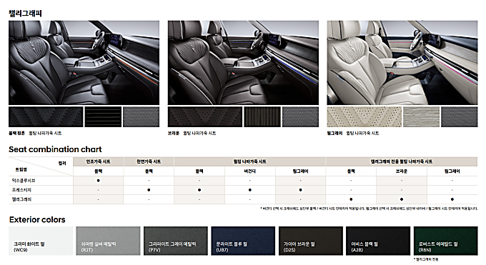 컴포트 - 퀼팅 나파가죽 시트(블랙/버건디/웜그레이 선택), 스웨이드 내장재(헤드라이닝/필라), 스마트 자세제어, 후석 승객 알림, 메탈 도어스커프, 메탈 리어범퍼스텝, 뒷좌석 수동식 도어커튼,운전석 에르고 모션 시트(18way, 볼스터 전동 조절, 레그레스트, 스트레칭 모드 포함), 동승석 10way 전동시트(레그레스트 포함), 동승석 2way 럼버서포트, 동승석 워크인 디바이스, 1열 릴렉션 컴포트 시트,3열 파워폴딩시트, 3열 열선시트