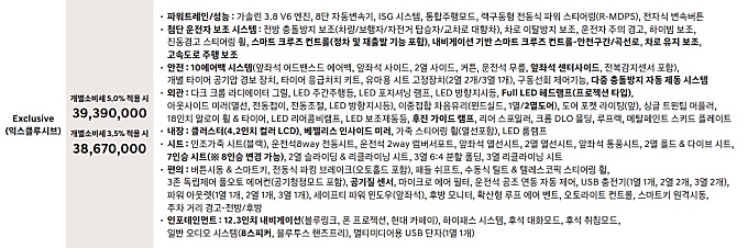 가장 기본모델 시작 가격은 3867만원이다. 여기에는 , 스마트 크루즈 컨트롤(정차 및 재출발 기능 포함), 내비게이션 기반 스마트 크루즈 컨트롤-안전구간/곡선로, 차로 유지 보조, 고속도로 주행 보조, 10에어백 시스템, 다중 충돌방지 자동 제동 시스템, 다중 충돌방지 자동 제동 시스템, 후진 가이드 램프, 클러스터(4.2인치 컬러 LCD), 베젤리스 인사이드 미러, 공기질 센서, 12.3인치 내비게이션이 기본으로 들어가 있다.