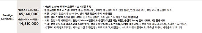디젤2.2 모델 - 익스클루시브 4014만원, 프레스티지 4578만원, 캘리그래피 5216만원으로 책정되었다.(개별소비세 3.5% 기준)