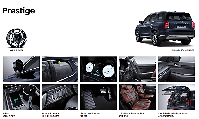 더 뉴 팰리세이드 2번째 트림으로 프레스티지에는 익스클루시브 옵션은 기본으로 들어가고 추가로 발수 적용 앞도어 유리, 퍼들램프, 메탈 페달, 클러스터(12.3인치 컬러 LCD), 운전석 10way 전동시트(쿠션익스텐션 기능 포함), 운전석 4way 럼버서포트, 2열 통풍시트, 전동식 틸트 & 텔레스코픽 스티어링 휠, 전후석 통합 터치 공조 컨트롤, 디지털 키 2 터치 등이 추가로 들어가게 된다.