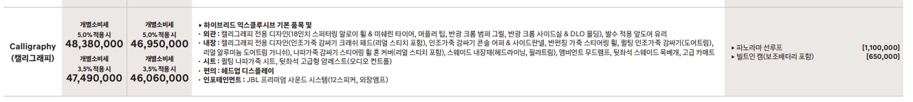 최상위 트림으로, 캘리그래피 전용 18인치 휠&타이어 크롬 범퍼 그릴, 발수 적용 앞도어 유리, 리얼 알루미늄 도어트림 가니쉬), 나파가죽 감싸기 스티어링 휠 혼 커버(리얼 스티치 포함), 스웨이드 내장재(헤드라이닝, 필라트림), 앰비언트 무드램프, 뒷좌석 스웨이드 목베개, 고급 카매트 등 이 적용된다. 하위 트림들의 옵션이 기본으로 들어가 있다고 보면 된다.