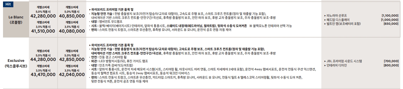 기본 2.4 가솔린 하이브리드 엔진이 장착되며, 차로 이탈방지 보조, 차로 유지 보조, 9에어백 시스템, 급제동 경보기능, 17인치 휠&타이어, 이중접합 차음유리(1열&2열), 클러스터 12.3인치 계기판, 터치식 공조 컨트롤러, 천연가죽시트 등이 탑재 된다