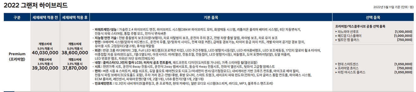 2022 그랜저 하이브리드 모델의 가격 인상폭은 가솔린 차량에 비해 소폭 더 상승했다. 이유는 배터리 가격인상에 따른 이유가 아닐까?? 이번 2022 그랜저 하이브리드 연식변경으로 가장 하위 트림인 프리미엄트림부터 12.3인치 LCD 계기판, 터치식 공조 컨트롤러가 기본 장착되며 그외 차량 사양은 동일하며 옵션가격 또한 동일하다. 단 빌트인캠 옵션은 75만원으로 인하되었다.