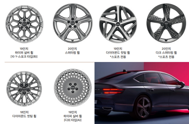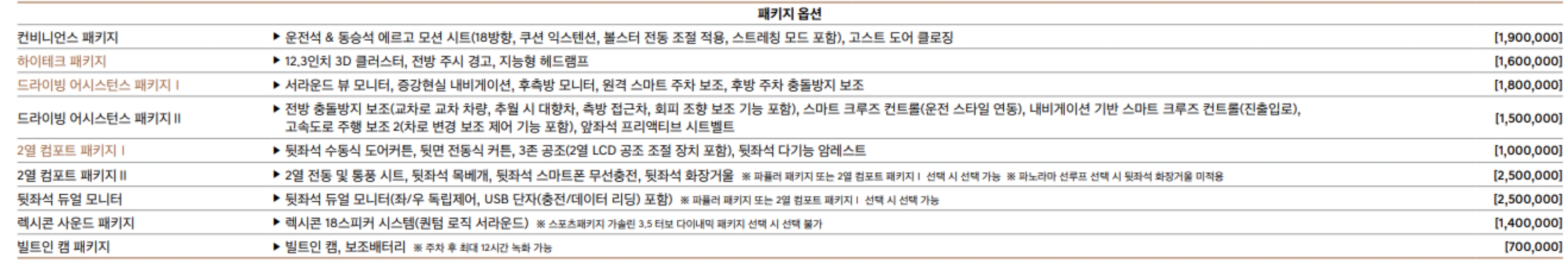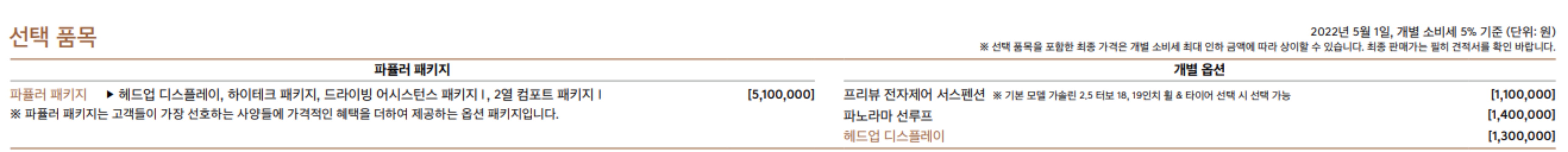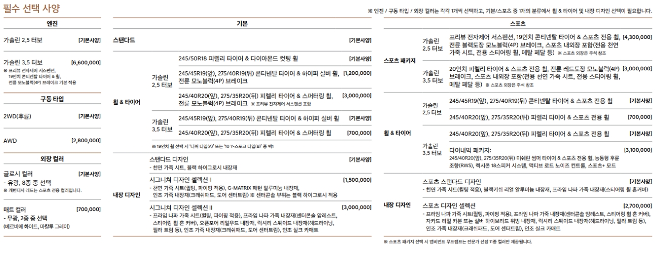 사륜 280만, 무광 컬러 70만원, 가솔린2.5 19인치 휠&모노블럭(4P) 120만원, 가솔린3.5 20인치 휠&모노블럭(4P) 300만원, 시그니처 디자인 셀렉션 150만원 ~ 300만원, 스포츠 패치지 가솔린2.5 430만원, 스포츠 패치지 가솔린3.5 300만원, 스포츠 디자인 셀렉션 270만원
