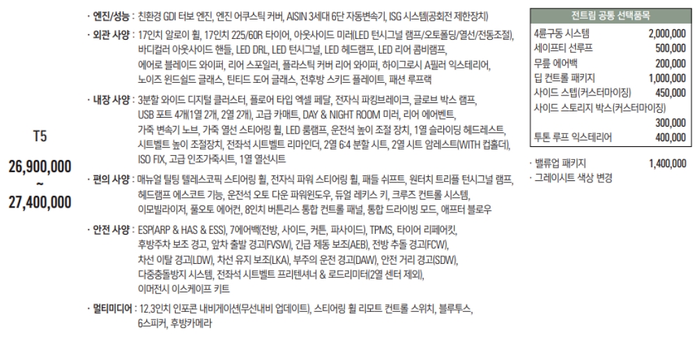 | 쌍용자동차 토레스 | T5 | 2690만원 ~ 2740만원 |