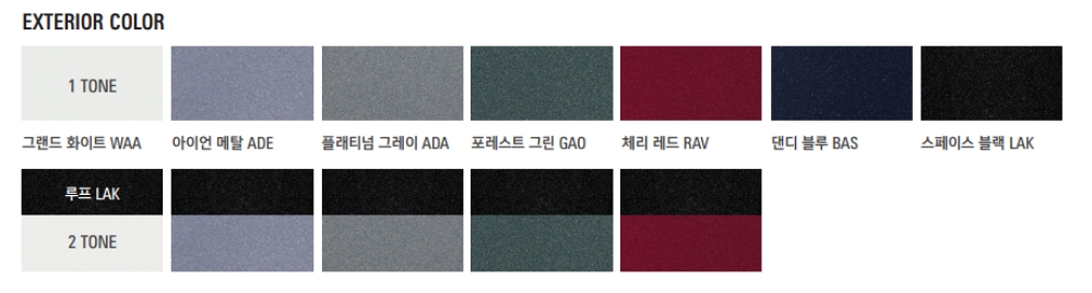 바디컬러 아웃사이드 핸들, LED DRL, LED 턴시그널, LED 헤드램프, LED 리어 콤비램프,에어로 블레이드 와이퍼, 리어 스포일러, 플라스틱 커버 리어 와이퍼, 하이그로시 A필러 익스테리어,노이즈 윈드쉴드 글래스, 틴티드 도어 글래스, 전후방 스키드 플레이트, 패션 루프랙