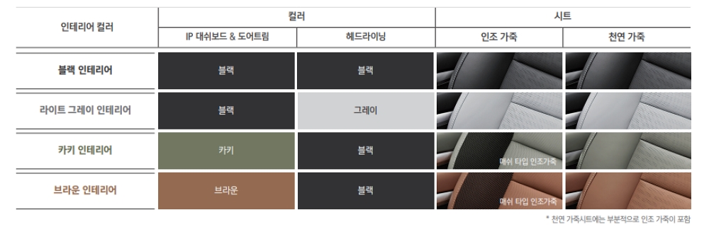 | 천연 가죽시트 패키지 | 고급 천연 가죽시트 + 동반석 파워시트 + 천연 가죽시트 색상별 인테리어 적용 + 3D 매쉬매트 | |
