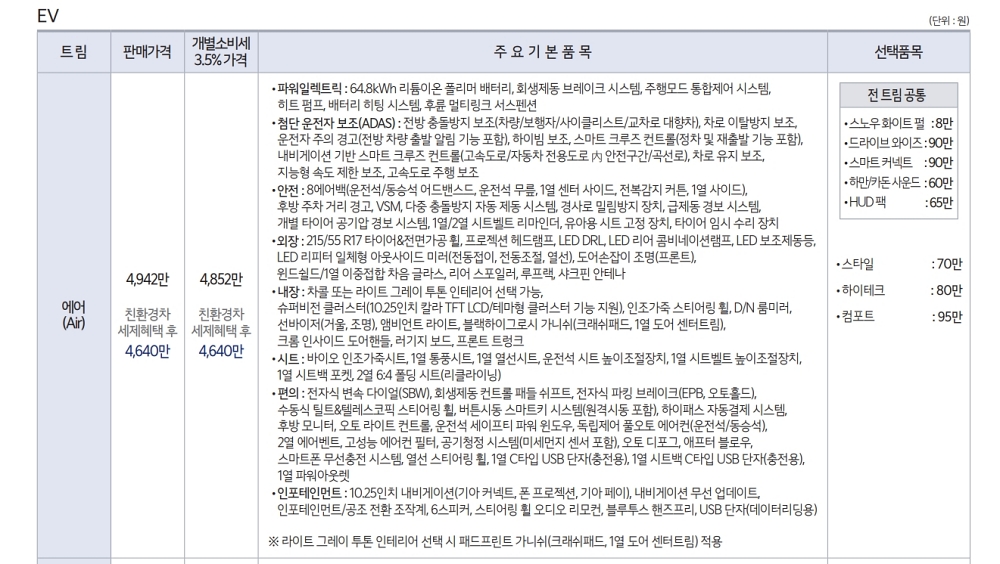 | 하이테크 | 스마트 파워테일게이트, 실외 V2L 커넥터, 실내 V2L 콘센트 |