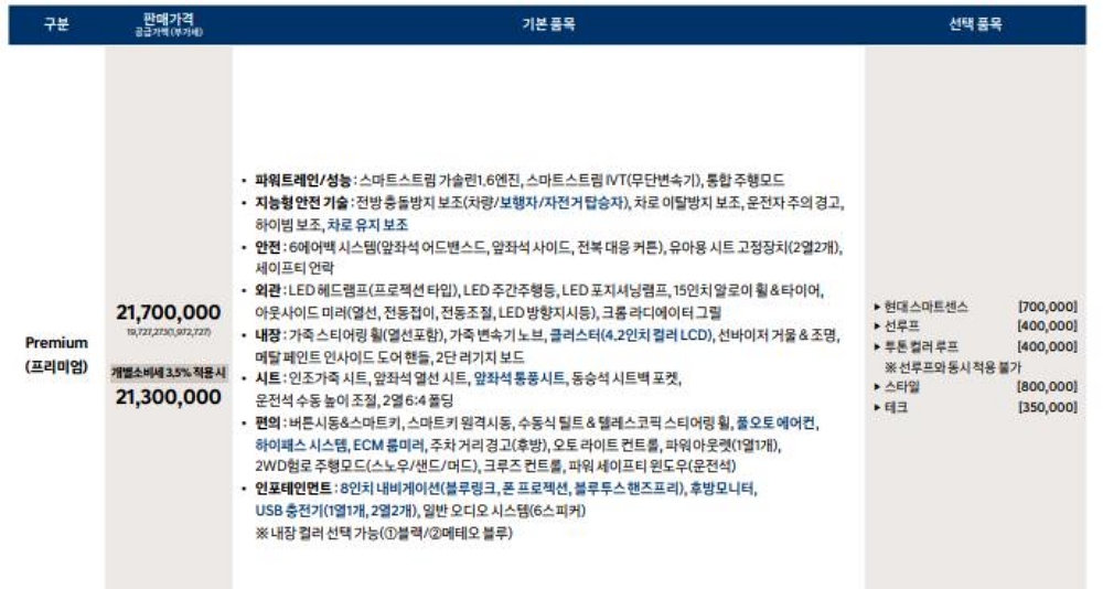 2023년 베뉴 프리미엄 기본 트림은 1.6 가솔린 엔진, 차로 유지 보조, 클러스터(4.2인치 컬러 LCD), 인조가죽 시트, 앞좌석 열선 시트, 앞좌석 통풍시트, 오토 에어컨, 하이패스 시스템, ECM 룸미러 등이 들어가게 됩니다.
