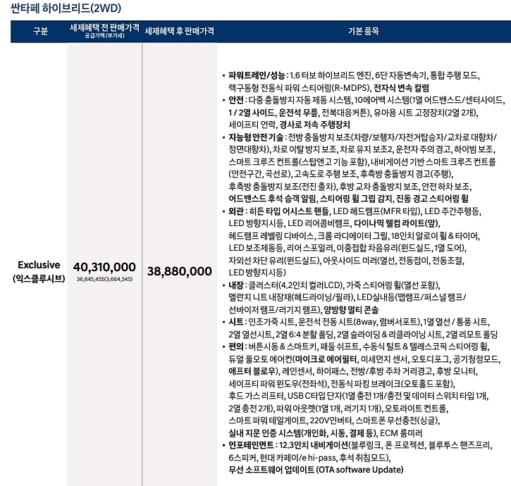 싼타페 하이브리드 옵션 가격표 익스클루시브